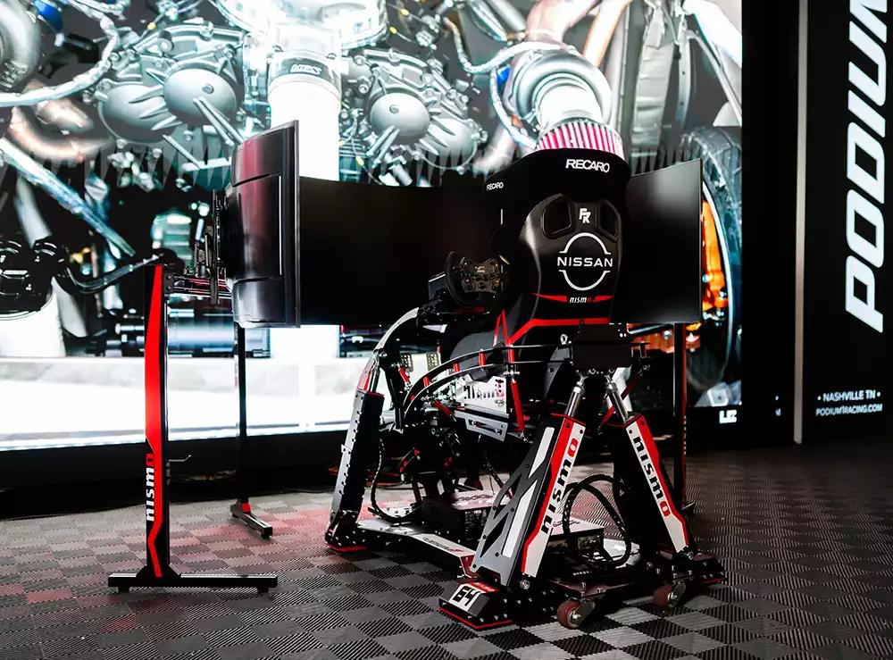 Nissan's SEMA booth brings the GT-Z experience to life with a custom Podium 1 racing simulator, featuring a bespoke racing seat and immersive setup that lets SEMA attendees virtually pilot the GT-Z racing car.
